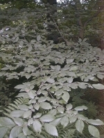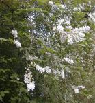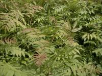 Shrub up to 2 m high giving numerous offshoots, forming dense thickets. Shoots thick and stiff, upright with an orange core. Leaves imparipinnate up to 25 cm long, leaflets (from 13 to 25), pointed, densely doubly serrated. Flowers white about 8 mm in diameter, fluffy, gathered in rich, branched, conical, terminal panicles (up to 30 cm long), honey-bearing. Fruits composed of small pods fused at the base. Decorative shrub due to early leaf development and numerous fluffy inflorescences, provided it grows in the sun. Spreads quickly and easily becomes wild. Soil-protecting shrub.