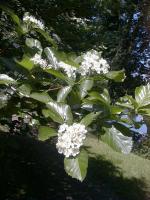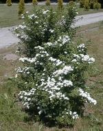 A beautiful, sprawling shrub, wide and dense, with drooping branches reaching up to 2 m in height. The leaves are rhomboid-ovate (2-4 cm long), slightly lobed and toothed, smooth, dark green on top, bluish underneath. White flowers in flat corymbs. An extraordinary decorative effect during flowering, especially on slopes – cascades of small white flowers. Nice autumn coloration. The shrub is frost-resistant. It can be planted in partial shade, but blooms more abundantly in the sun.