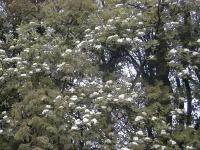 A tall shrub or tree up to 15 m high, with overhanging branches and bark that remains smooth for a long time. Produces root suckers. Shoots are quite thick, reddish-brown. Leaves are ovate-elliptical, pointed, 10-15 cm long, finely serrated, grayish and bluish-green underneath. Flowers are white, small, 1-1.5 cm in diameter, gathered in dense clusters, with an unpleasant smell. Fruits are in hanging clusters, spherical, 6-8 mm in diameter, turning black and shiny when ripe. A decorative shrub during flowering - a mass of white flowers. Frost resistant.