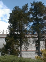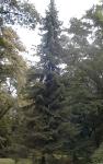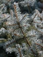 A tree growing up to 30 m in height. Branches and twigs usually arranged horizontally, in regular whorls. Shoots light brown, bare and shiny, deeply grooved. Needles ranging from 1.5 to even 3 cm long, matte, four-sided in cross-section, from gray-green to silvery-blue, very sharp-pointed, arranged around the shoots - "bristly erect". Cones large, 6-10(12) cm long, light brown, hanging. A very decorative tree due to needle color both in the growing season and in winter, valuable for color combinations (see - photo of the castle from the south side).