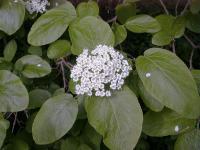 Shrub up to 1.5 m tall. Shoots are red. Leaves narrowly obovate, 2.5-3.5 cm long, entire, glabrous, dark green on top, bluish-green underneath, they remain on the shrub for a long time in autumn. Flowers white, small, gathered in dense hemispherical corymbs. Blooms abundantly if grown in the sun. Very nice shrub.