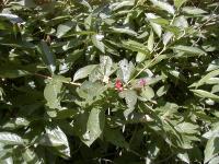 A spherical shrub about 4-5 m tall and wide, with widely spread, long branches. Shoots are hairy. Leaves are ovate-elliptical, 5-8 cm long, with a long tip at the apex, dark green on top, lighter underneath. Flowers about 2 cm long, white, turning yellow as they fade, fragrant, very honey-bearing, pleasantly scented, especially in the evening. Fruits are red and spherical, remaining on the shrubs until November. A very decorative shrub, spherical in shape, leaves remain on the shoots for a long time, falling green in November. Frost resistant.