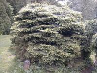 Broadly conical shape, grows slowly. Branches long and sparsely branched, thread-like, hanging scales colored golden. Old specimens growing in a good location, branched and dense from below, from a distance look like a haystack.
