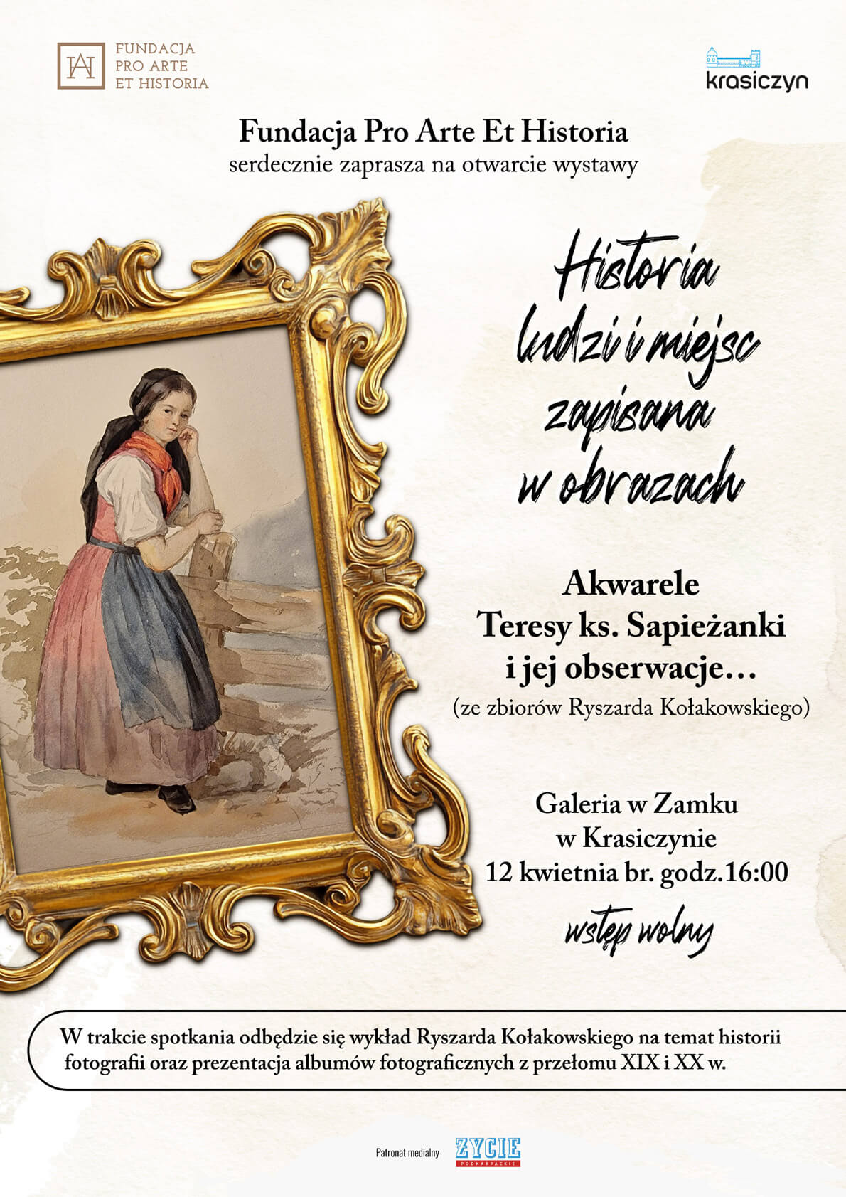Fundacja Pro Arte Et Historia serdecznie zaprasza w dniu 12 kwietnia br. o godz. 16:00 do galerii w krasiczyńskim zamku na otwarcie wystawy akwarel i szkiców Teresy ks. Sapieżanki. Prace wykonane zostały w II połowie XIX wieku i prezentują dorobek artystyczny córki Leona Ludwika ks. Sapiehy.